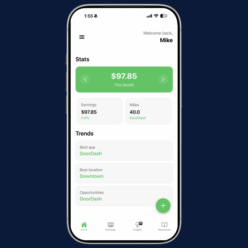 See your daily earnings, mileage, and app trends all in one place. ShiftMate’s clean dashboard helps you stay focused and track progress every time you work — no setup required.